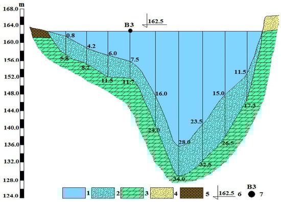 Geological–lithological cross-section of Lake Doshne basin. Legend: 1—water, 2—carbonate sapropel, 3—chalk, marl, 4—sand, 5—peat, 6—absolute mark of the water surface, m (according to the Baltic Height System), and 7—B3 borehole.
