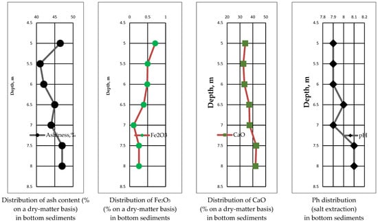The results of geochemical studies of bottom sediments at sounding point 3/1 demonstrated considerable variability in the ash content (% on dry matter) of sapropel, ranging from 41.0% to 47.0%, with an average value of 44.64%. The content of Fe2O3 compounds in sapropel deposits showed similar variability, ranging from 0.11% to 0.50%, with an average of 0.39%. The concentration of sulfate compounds varied from 32.64% to 42.66%, with an average content of 37.11%. The degree of acidity (salt extract, pH) in the profile of bottom sediments ranged from moderately alkaline (7.9) to strongly alkaline (8.1), with an average value of 7.97 (Figure 7).