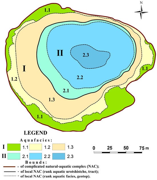In the structure of Lake Doshne’s natural aquatic complex (NAC), littoral–sublittoral and profundal aquatic sub-tracts are distinguished. The littoral–sublittoral aquatic sub-tract is the largest, covering 56.5% of the area, and is represented by three types of aquafacies.