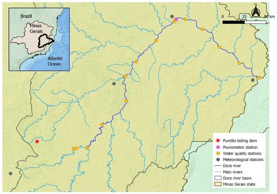 The Doce River Basin, which covers 86,715 km2, is located between the states of Minas Gerais and Espírito Santo and is the fifth largest watershed in Brazil (Figure 1). It has a humid subtropical climate with rainy summers and dry winters [26]. Over the last 20 years, the average annual rainfall has been 1036.10 mm per year, with rainfall concentrated between October and March [27]. With a population of about 3.1 million inhabitants, the basin is experiencing continuous urbanization. The primary economic activities include mining, industry, and agriculture [28,29,30,31].