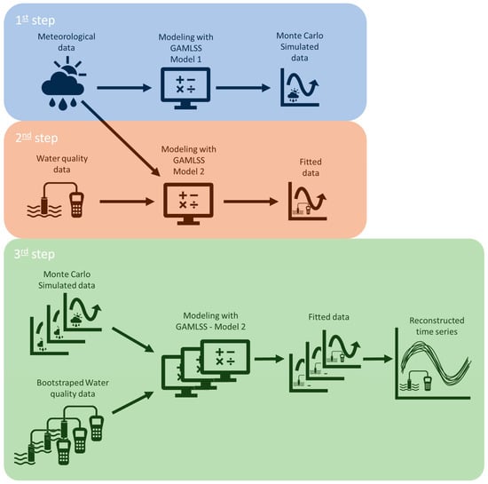 We employed a bootstrap resampling method to construct confidence intervals for the estimates. For precipitation, we used simulated data from the model fitted in the “Analysis and Modeling of Precipitation Data” section and resampled the water quality data with replacement. Each iteration involves drawing a bootstrap sample and fitting a GAMLSS model described above. The predictions for each water quality parameter were extracted, and the entire process was repeated 50 times (Step 3 in Figure 2). In addition, long-term trends for each variable were extracted from the model. Seasonality was evaluated using the median value for each month for each period (further details on the definitions of these periods are provided in the sections below). All statistical analyses were performed using R software 4.1.3.