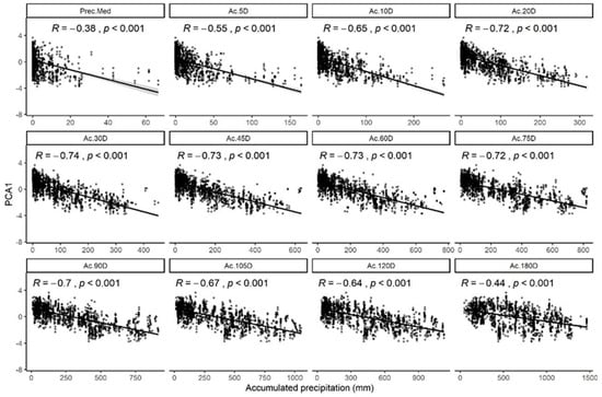 Scatter plots of the accumulated rainfall over different accumulated intervals with principal component 1 scores (PC1). Pearson correlation, p-values and the line representing the regression slope are indicated.