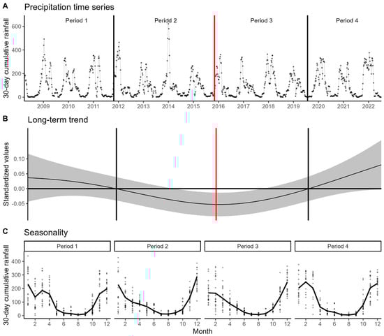(A)—Time series of the 30-day accumulated rainfall (average of the four INMET stations); the points represent the measured values. (B)—Long-term trend estimated by the GAMLSS model. The solid line represents the average, and the shaded area represents the standard error. The red vertical line represents the collapse date, and the horizontal line represents the average for the period. (C)—Seasonality across the four periods. The solid black line indicates the monthly median for that period.