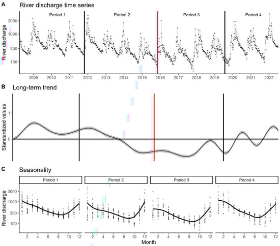 (A)—Time series of the flow from Governador Valadares station, the points represent the measured values. (B)—Long-term trend estimated by the GAMLSS model. The solid line represents the average and the shaded area represents the standard error. The red vertical line represents the date of the collapse, and the horizontal line represents the average for the period. (C)—Seasonality across the four periods, the solid black line indicates the monthly median for that period.