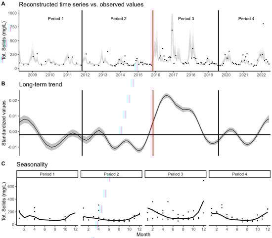 (A)—Reconstructed time series of total solids. For clarity, the plot shows the data observed only from a single sampling station (RD035). The black dots represent the observed values, and the grey lines represent the fitted values from the 50 bootstrap samples. (B)—Long-term trend estimated by the GAMLSS model. The solid line and the shaded area represent the mean and the standard error, respectively. The red vertical line marks the collapse date, and the horizontal line represents the average for Period 1. (C)—Seasonality across the four periods. The solid black line indicates the monthly median for that period.