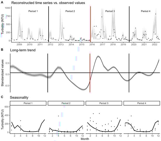 (A)—Reconstructed time series of turbidity. For clarity, the plot shows the data observed only from a single sampling station (RD035). The black dots represent the observed values, and the grey lines represent the fitted values from the 50 bootstrap samples. (B)—Long-term trend estimated by the GAMLSS model. The solid line and the shaded area represent the mean and the standard error, respectively. The red vertical line marks the collapse date, and the horizontal line represents the average for Period 1. (C)—Seasonality across the four periods. The solid black line indicates the monthly median for that period.