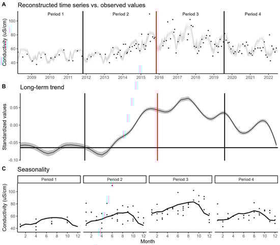 (A)—Reconstructed time series of conductivity. For clarity, the plot shows the data observed only from a single sampling station (RD035). The black dots represent the observed values, and the grey lines represent the fitted values from the 50 bootstrap samples. (B)—Long-term trend estimated by the GAMLSS model. The solid line and the shaded area represent the mean and the standard error, respectively. The red vertical line marks the collapse date, and the horizontal line represents the average for Period 1. (C)—Seasonality across the four periods. The solid black line indicates the monthly median for that period.