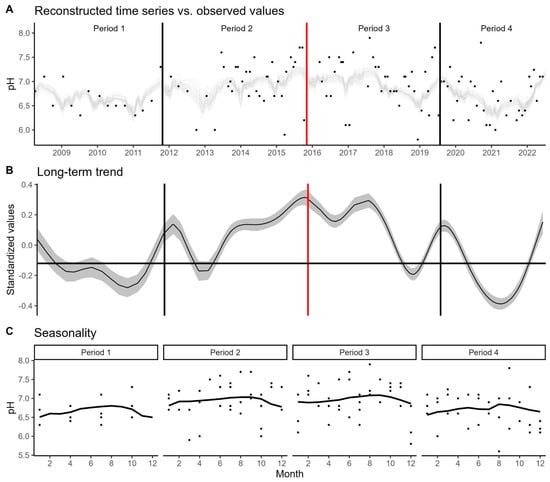 (A)—Reconstructed time series of pH. For clarity, the plot shows the data observed only from a single sampling station (RD035). The black dots represent the observed values, and the grey lines represent the fitted values from the 50 bootstrap samples. (B)—Long-term trend estimated by the GAMLSS model. The solid line and the shaded area represent the mean and the standard error, respectively. The red vertical line marks the collapse date, and the horizontal line represents the average for Period 1. (C)—Seasonality across the four periods. The solid black line indicates the monthly median for that period.