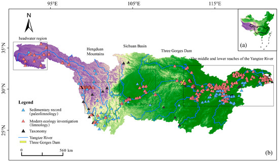 Location of the Yangtze River Basin in China (a) and the sampling sites of diatom research in the Yangtze River Basin (b). Each triangle represents a sampling site, where diatoms in sediments and/or water column have been investigated.