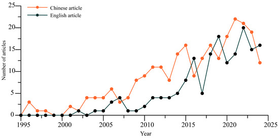 There were 253 Chinese articles and 166 English articles, with increasing trends from 1995 to 2024 (Figure 2). Chinese and English articles displayed an annual increase rate of 5.08% and 13.43%, respectively (Table 1). Less than 10% of all the articles were contributed by international cooperation (Table 1).