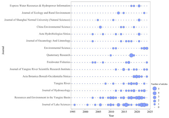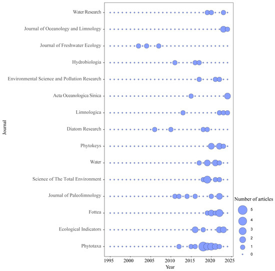 Most Chinese articles were published in the Journal of Lake Science, Resources and Environment in the Yangtze Basin, Journal of Hydroecology, and Yangtze River (Figure 3). The annual number of articles in the top two journals displayed an increasing trend. According to the number of English articles, the top five journals were Phytotaxa, Ecological indicators, Fottea, Journal of Paleolimnology, and Science of the Total Environment (Figure 4).