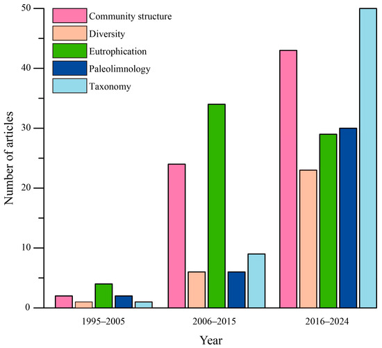 Eutrophication was the major research topic in diatom research before 2015, but the number of related articles on eutrophication decreased thereafter (Figure 5). The articles on the topics of community structure, diversity, paleolimnology, and taxonomy increased gradually. In particular, diatom taxonomy has become the most popular topic during recent years (Figure 5).