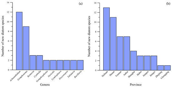 Presently, most new diatom species were found after 2012 and belonged to three genera, including Achnanthidium, Gomphonema, and Cymbella. For example, 12 new species of Achnanthidium have been identified, including Achnanthidium lacustre Yu, You, and Kociolek, Achnanthidium sublanceolatum Yu, You, and Kociolek, Achnanthidium taipingense Yu, You, and Kociolek, Achnanthidium anhuense Yu, You, and Wang, Achnanthidium qingxiense You, Yu, and Wang Achnanthidium rostropyrenaicum Jüttner and Cox, Achnanthidium longissimum Yu, You, and Kociolek, Achnanthidium jiuzhaiense Yu, You, and Wang, Achnanthidium epilithicum Yu, You, and Wang, Achnanthidium limosum Yu, You, and Wang, Achnanthidium subtilissimum Yu, You, and Wang, and Achnanthidium kangdingnese Yu, You, and Wang. Nine new species of Gomphonema have been identified, including Gomphonema yaominae Li, Gomphonema qii Yu, You, Kociolek, and Wang, Gomphonema poyangense Yu, You, Kociolek, and Wang, Gomphonema longganense You, Yu, Kociolek, and Wang, Gomphonema shanghaiense Zhang and Kociolek, Gomphonema bigutianchnense Li, Gomphonema bicepiforme Zhang and Kociolek, Gomphonema jianghanense Li, Gong, Xie, and Shen, and Gomphonema minutiforme Bertalot and Reichardt (Figure 6a). In terms of study sites, three hotspot regions include Sichuan Province (13 new species), Hunan Province (10 new species), and Yunnan Province (7 new species) (Figure 6b). Li and others described 13 new diatom species belonging to 5 genera in 9 plateau lakes of Yunnan Province [15], including Aulacoseira dianchiensis Yang, Stoermer, and Kociolek [24], Gomphosinica lugunsis Liu, Kociolek, You, and Fan [25], and Navicula yunnanensis Li and Metzeltin [26].