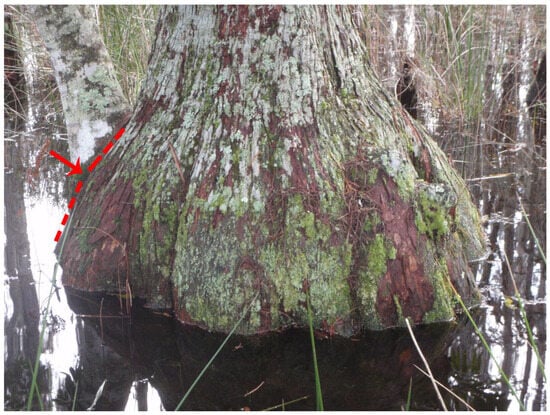 Within west-central Florida cypress dome wetlands, “normal pool” (NP) elevations can be derived from the inflection or taper point on cypress tree buttressing, that is, the point where the buttress angle changes (Figure 1). This NP indicator is associated with the uppermost 1 to 5% of wetland water levels [1,11,12,13,14,15]. Water levels at many wetlands in this region were historically influenced by groundwater withdrawals [16]. However, cypress dome morphology and regional precipitation patterns can allow high water levels to achieve NP even when lower water levels are depressed [16,17]. Thus, NP can serve a useful indicator of baseline hydrology even in cypress domes that have been hydrologically impacted for decades.
