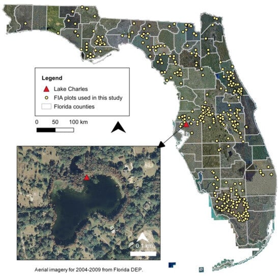 Map showing the state of Florida with Forest Inventory and Analysis (FIA) plots used in this study, with an inset of Lake Charles.