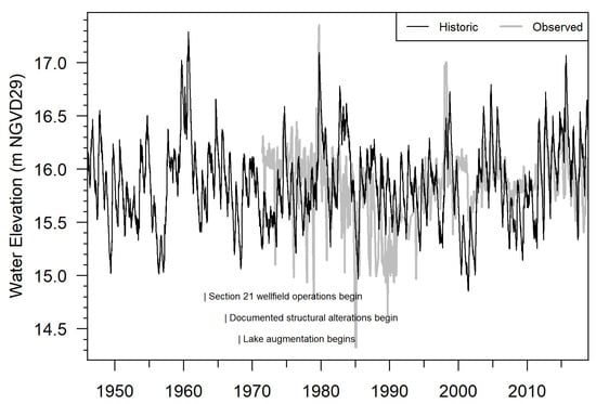 Lake stage data for Lake Charles are available since 1971 (Figure 3). Modeling work was previously completed to simulate “historic” lake levels (Figure 3) [33]. Historic lake levels represent the absence of regional groundwater withdrawals and lake augmentation but with modern structural and land development conditions present. Modeling suggests that upper decile water levels are currently about 0.2 m (m) lower than historic conditions. However, this value relies on current wellfield operations and structural conditions, which are less intensive relative to the 1960s–1990s [33]. Since 2010, structural, withdrawal, and augmentation conditions at the lake have been relatively stable [16,33]. Under modern withdrawal conditions, impacts on median water levels are relatively small [16,33].