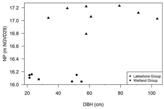 For the lakeshore group, the mean NP and DBH were 17.1 m and 66.3 cm, respectively. The mean NP elevation corresponded to the >99th exceedance percentiles of modeled historic, modeled current, and observed water levels.