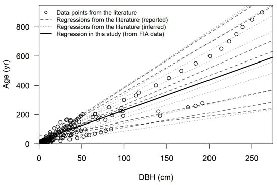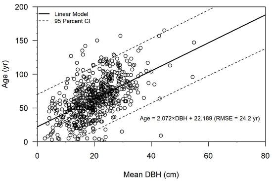where A is age in years and D is DBH in cm. The model’s root mean square error (RMSE) was 24.2 years. The regression fell within values from the literature (Figure 6). Cross-validation yielded similar results for slope (range 1.985–2.171, mean 2.072), intercept (range 20.546–24.071, mean 22.203), and RMSE (range 20.0–27.5, mean 24.1 years).