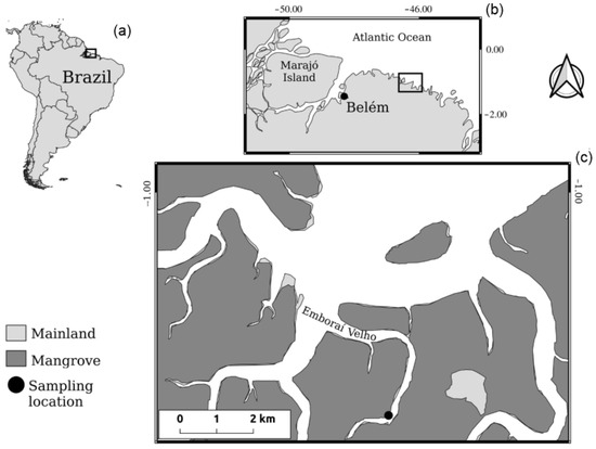 The estuary of the Emboraí Velho River (0°52′54″ S and 46°26′54″ W; Figure 1) is located in the village of Nova Olinda, about 36 km from the municipality of Augusto Corrêa, which belongs to the system of mangroves on the Urumajó Coast, showing a hydrography with wide coastal bays [42]. This estuary is located in an Área de Proteção Ambiental (environmental protection area), the Araí-Peroba Extractive Reserve [43].