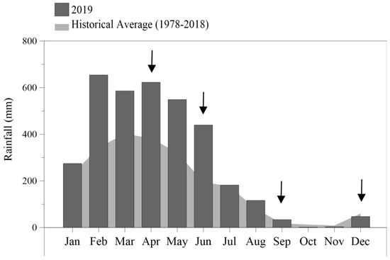 Historical average rainfall for the last 40 years (1978–2018) and for the year 2019. The arrows indicate the months of samplings.
