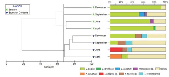 Cluster analysis and relative abundance of the principal diatoms identified in the gut content and the estuarine environment during the study.