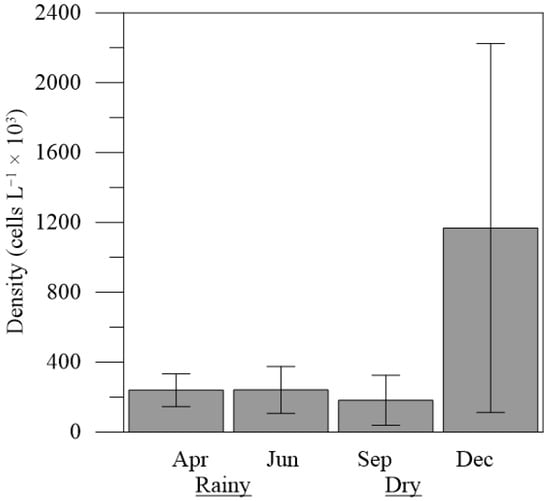 The total density of the diatoms identified in the samples from the Emboraí Estuary showed averages that varied between 181.6 ± 135.2 × 103 cells L−1 (September) and 1167.7 ± 995.6 × 103 cells L−1 (December), with values observed in December significantly higher (H = 4.35; p < 0.05; Figure 4).