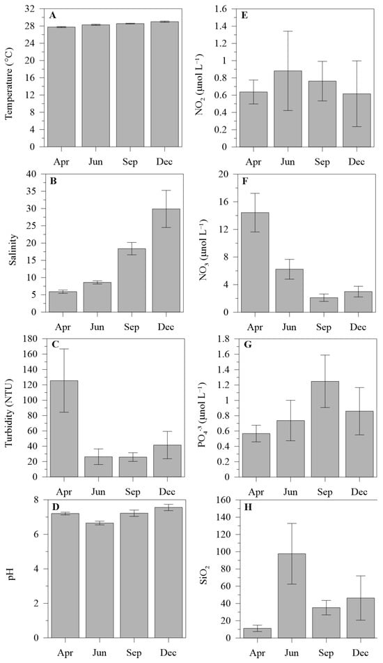 Monthly variation (± standard deviation) of abiotic variables: temperature (A), salinity (B), turbidity (C), pH (D), and concentrations of dissolved nutrients NO2− (E), NO3− (F), PO43− (G) and SiO2 (H) during the year 2019 in the estuary of Emboraí Velho. Note difference in scales.