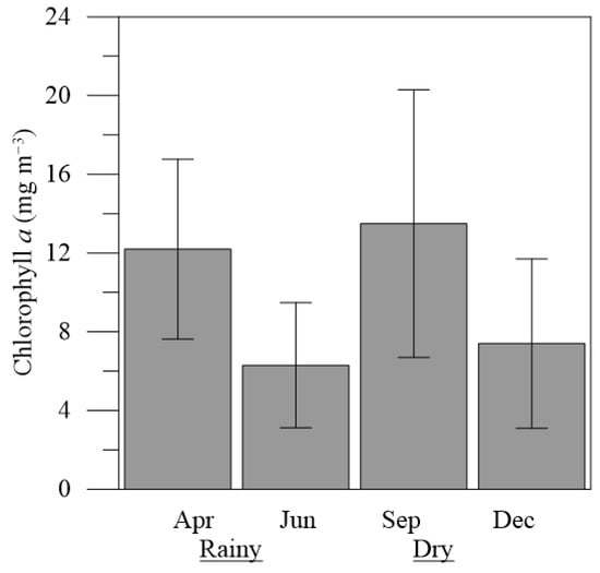 Chlorophyll a concentrations showed averages ranging from 6.3 ± 3.2 mg m−3 (June) to 13.5 ± 6.8 mg m−3 (September), the latter being significantly higher than those recorded in the other months studied (H = 9.36; p < 0.05) (Figure 6).