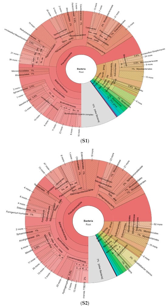 The metagenomic analysis showed a bacterial abundance between 54% (S1) and 63% (S2) in the sediments and the other sequences did not present similarity with the genomic region studied (Figure 2). The Pseudomonadota phylum predominated in both sediments with 71–75% abundance. Within this phylum the Beta proteobacteria was dominant (51%—S2, 38%—S1) followed by Alpha proteobacteria (38%—S1, 17%—S2) and Gamma proteobacteria (23%—S2, 17%—S1). Terrabacteria (10–12%), other bacteria (7–10%), and Acidobacteria (3%) were also detected in both sediments. On the other hand, Archaea was found in both samples (0.3–1%) with a dominance of Euryarchaeota (84%) followed by Nitrososphaeria (11%) and Methanomassilliicoccales (5%) at S1 and Nitrososphaerota (78%) followed by Euryarchaeota (21%) at Figure 2 (S2).