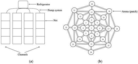 Experiments were performed in custom-designed polymethyl methacrylate (PMMA) systems simulating environments with both flowing and still water conditions. The flowing-water system (Figure 1a) consisted of four artificial channels, each 288 cm in length, 30 cm in height, and 38 cm in width. Each channel was subdivided into four compartments (40 cm in length) using frames fitted with a 0.2 mm mesh net to prevent detritus displacement or detritivore movement between compartments. A recirculating pump system, equipped with a refrigerator unit (18.0 ± 0.5 °C), provided a continuous mixing and recirculation of water through the system (approximately 300 L·h−1) and restored the oxygen level in the water. The still-water system was composed by twenty-five circular arenas (hereafter referred to as “patches”) interconnected as shown in Figure 1b. These included twenty-four patches arranged in three concentric rings and a single central patch, all connected both radially and laterally. Each patch measured 14 cm in diameter and 1.5 cm in height, and was connected to adjacent patches by narrow channels 2.4 cm in width. All patches were identified with a number.