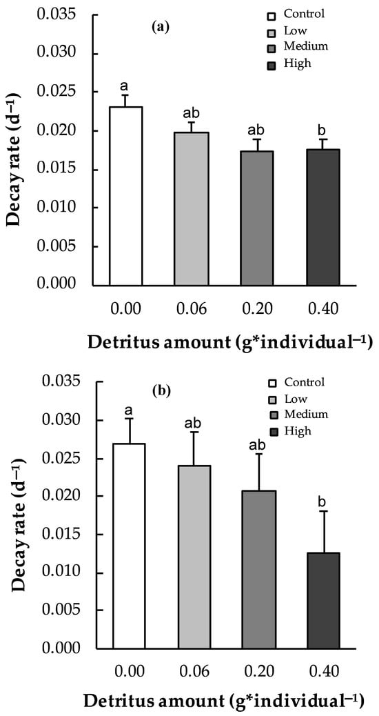 Decay rates (d−1) of P. australis leaf fragments under each experimental condition (control, low, medium, and high detritus) in the channel (a) and patch (b) microcosms. Error bars represent standard errors; different letters indicate statistically significant differences (p < 0.05).