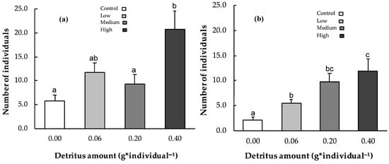 After 28 days, the number of surviving detritivores in the channels differed among treatments (one-way ANOVA, n = 16; d.f. = 3, 12; F = 6.87, p < 0.01; Figure 3a). The highest abundance was observed under high detritus conditions (20.8 ± 3.8), significantly greater than under medium (9.3 ± 2.0) and null detritus (5.8 ± 1.3) conditions (Tukey’s HSD test, p < 0.05 and p < 0.01, respectively).