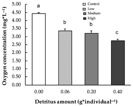 Water oxygen concentration (mg·L−1) across all experimental conditions (control, low, medium, and high detritus) in patch microcosm. Error bars indicate standard errors; different letters indicate statistically significant differences (p < 0.001).