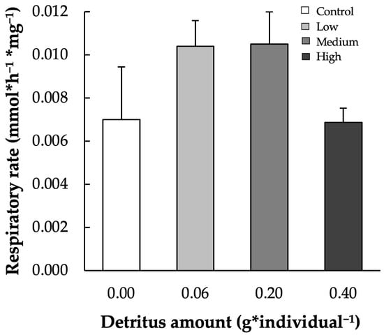 Respiration rate (µmmol·h−1·mg−1) across all experimental conditions (control, low, medium, and high detritus) in patch microcosm. Error bars indicate standard errors; there are no statistically significant differences.