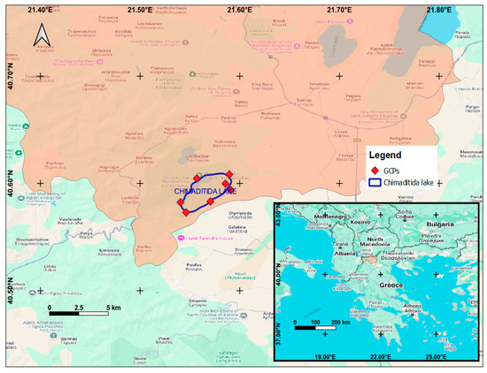 Since the lake has fluctuated in size over time, the official shapefile of the lake was received from the Hellenic Data Service website, which was created and last updated on 23 October 2018 (ref. [21], accessed on 7 March 2025). After long-term analysis conducted from 2018 to the present, it has been demonstrated that the shape and morphology of Chimaditida have not changed significantly since October 2018. Consequently, the aforementioned shapefile is recommended for use in this study. Figure 1, designed in QGIS version 3.16.11, shows the location of Chimaditida Lake within Greece and provides an overview of the area of interest.