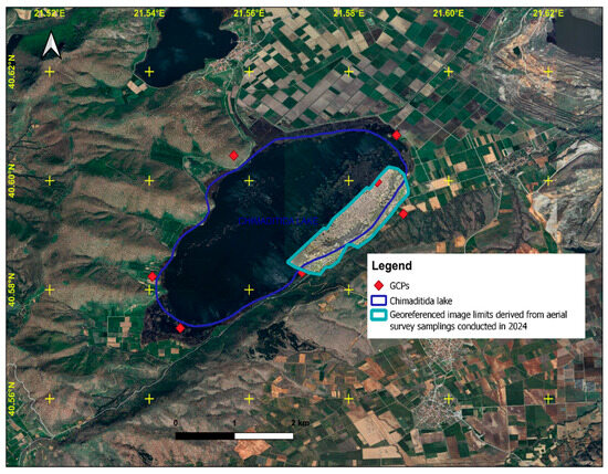 In this study, an aerial survey was conducted using a DJI Matrice M200 quadcopter UAS with a Parrot Sequoia multispectral camera to validate satellite-derived aquatic vegetation and open water. The camera includes four monochrome spectral bands (green, red, red edge, and near infrared) and an RGB lens, with an external sunshine sensor for lighting correction. The survey occurred at least three times per month from 1 March 2024 to 28 February 2025, with additional flights at the end of each season (31 May 2024, 31 August 2024, 30 November 2024, and 28 February 2025). The image acquisition was done at 120 m above ground level with 80% overlap and a flight speed of 4 m/s. Seven Ground Control Points (GCPs), depicted in Figure 1, were used for accurate exterior orientation, with coordinates surveyed using a Topcon Hiper V Real-Time Kinematic (RTK) Global Navigation Satellite System (GNSS) system. The image processing was completed in ODM V.3.5.4 software, resulting in RGB and multispectral orthomosaics with an average ground sampling distance (AGSD) of approximately 7 cm. As previously noted, the mean water depth of Chimaditida Lake is approximately equal to 1 m, and as a result, several species of FEAV were identified during the aerial survey. Notably, no significant presence of ABs was observed on the water surface in the samples examined. Additionally, due to the shallow nature of the lake, SAV was quite absent. Moreover, it is worth mentioning that the lake bottom was visible to the human eye since the lake is shallow (mean water depth 1 m).