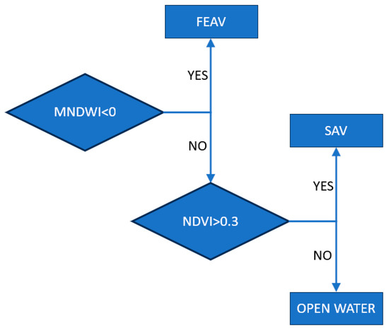As a result, it was found that MNDWI values of both SAV and water were higher than 0, while MNDWI values of FEAV were less than 0. Moreover, NDVI values of SAV were more distinguishable at around 0.3. It is important to note that SAV was found to constitute less than 0.3% of the study area, and due to its minimal contribution, it was not further analyzed. The entire methodology is illustrated in Figure 3.