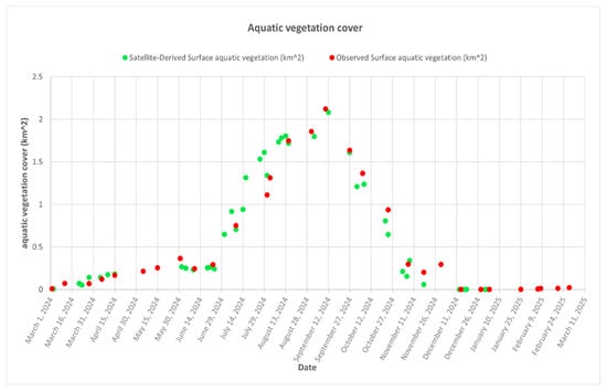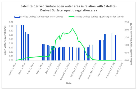 The average area of the open water class across all satellite-derived dates was 6.15 km2, of which 0.65 km2 was covered by aquatic vegetation. Given that the Chimaditida shapefile, as described in Section 2, covers an area of 9.58 km2 since 2018, it is evident that the remaining 3.43 km2 has experienced desiccation. Aquatic vegetation peaked with a score of 2.08 km2 on 9 September 2024, while its lowest value of 0.00067694 km2 was recorded on 28 December 2024. A steady decline in the extent of aquatic vegetation began on 7 October 2024. Similarly, for open water, its highest extent of 6.226 km2 occurred on 28 March 2024, while the minimum value of 6.119 km2 was observed on multiple dates throughout July, September, and October 2024.