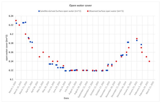 Values of Satellite-Derived Surface open water (km2) compared to Observed Surface open water (km2) time series.