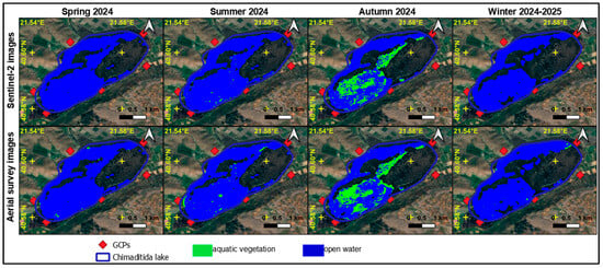 Aquatic vegetation and open water classification results based on Sentinel-2 and aerial survey images for each season during the study period.