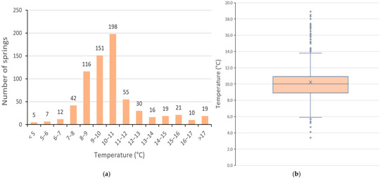 Number of springs by measured water temperature ranges (a) and total range of measured temperature values (b).