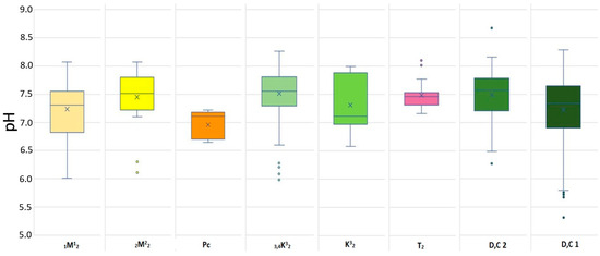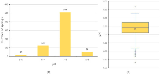At the largest number of springs, 509 of them (72.61% of those measured), the measured pH values of water were between 7 and 8. At 140 springs (19.97%) pH values were lower than 7, 15 springs even lower than 6. At 52 springs (7.42%) pH values were higher than 8 (Figure 4a). It is important to note that the pH values measured below 6.2 were statistically marked as outliers, as was the highest measured pH value of 8.67 (Figure 4b).