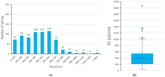 Number of springs by measured EC value ranges (a) and total range of measured EC values (b).