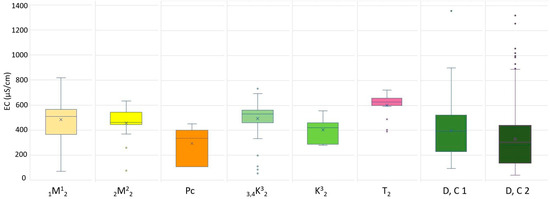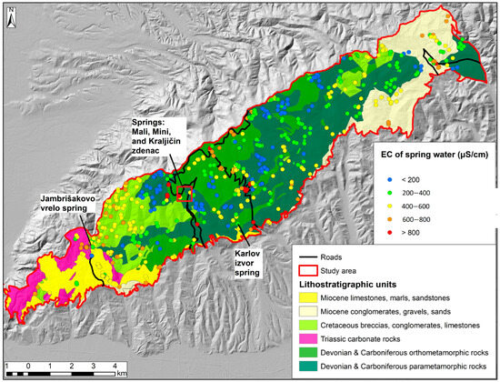The analysis of the measured pH and EC values in relation to the lithostratigraphic units showed that the smallest variations in EC values occur in the areas of the Middle Triassic dolomites (T2) and the Miocene lithothamnium limestones (2M22) (Figure 6, Table 2). These results can be explained by the carbonate lithological composition of these lithostratigraphic units. Triassic dolomites and Miocene lithothamnium limestones in the southeastern part of the study area are relatively well karstified [21,35,39,47]. This indicates that they can form significant aquifers in which water is retained over a longer period of time, reducing EC variability [48,49]. This is also evidenced by the relatively high EC values, which are the result of longer retention of water in the underground made of well-soluble rocks [48,50]. This statement may also be supported by the minimum pH values measured in that area, which are higher than 7.10 and significantly higher than all other minimum values in the area of other lithostratigraphic units (Figure 7).