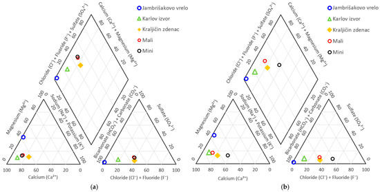 According to the water analyses from both November 2022 and April 2023, the Jambrišakovo vrelo and Karlov izvor springs are of the calcium-bicarbonate type (Table 3 and Table 4, Figure 9). It is important to note that the Jambrišakovo vrelo spring has very high levels of bicarbonate ions and also higher levels of magnesium ions compared to the other springs. The springs Mali, Mini and Kraljičin zdenac belong to the same type, but have borderline values towards the mixed spring type, i.e., the calcium-chloride type [43,44]. Also noteworthy is the relatively high proportion of sodium and chloride ions in the Kraljičin zdenac, Mali and Mini springs. In the April analysis, the Mini spring showed characteristics of a mixed type between the calcium-chloride and calcium-carbonate type (Table 3 and Table 4, Figure 9).