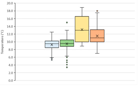 Ranges of measured spring water temperatures in winter (blue), spring (green), summer (yellow) and autumn (orange).