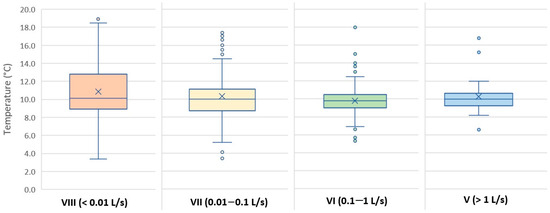 Additional arguments in favour of these claims are provided by the ranges of measured spring water temperature values within different categories of spring discharges. It can be seen that the absolute amplitude decreases with increasing discharge, as does the range of temperature values between the first and third quartiles of the measured temperatures (Table 6, Figure 11). The standard deviation and the coefficient of variation show the same result, with the exception that for springs of discharge category VI (0.1–1 L/s) where the value of the standard deviation and the coefficient of variation is lower than that for springs of category V (>1 L/s) (Table 6, Figure 11). This distribution of temperature variability by discharge categories is presumably a consequence of the aforementioned susceptibility of springs with low discharge to temperature changes due to external influences and the shorter retention time of water in the underground, especially in the case of low temperatures.