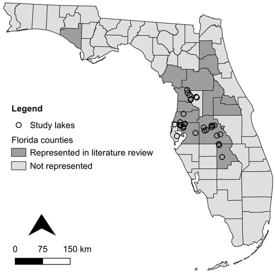 Map of lakes analyzed in this study and counties captured in the literature review.