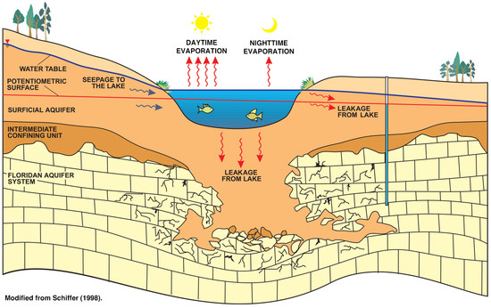 Florida contains over 7000 freshwater lakes, primarily formed by karst dissolution processes creating depressions that intersect the water table [44,45]. Central Florida lakes gain water from precipitation, runoff, and the surficial aquifer, and lose water through evaporation and leakage to the Upper Floridan aquifer (Figure 2) [14,23,45,51]. Additionally, various Florida lakes have channel inflow or channel outflow, although over 70 percent are closed basin systems [14,45].