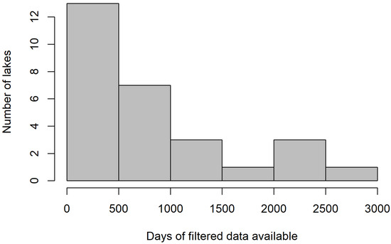Histogram of days of data available at study lakes (n = 28) after filtering.